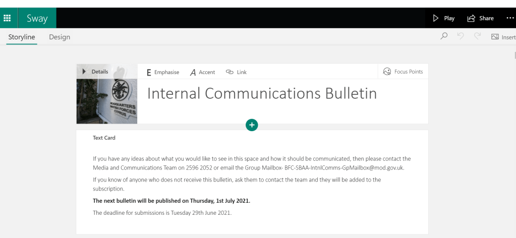 Part of my role in Media and Communications was to create the Internal Communications Bulletin every Thursday. Microsoft Sway is a very simple newsletter programme. It is used as a vehicle to update all subscribers on the latest news and events happening on the Bases.